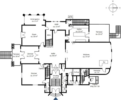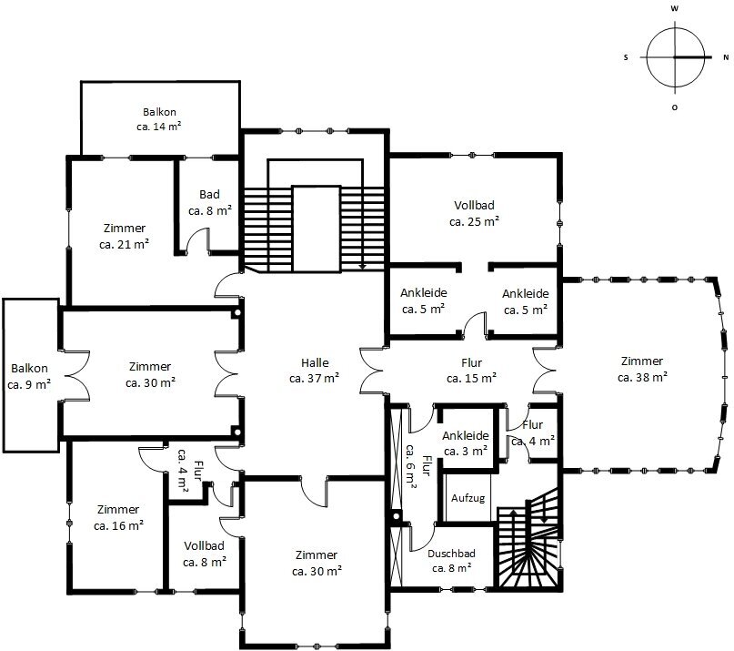 Der interne Fahrstuhl und ein separates Treppenhaus führen bis in das zweite Obergeschoss der Villa.