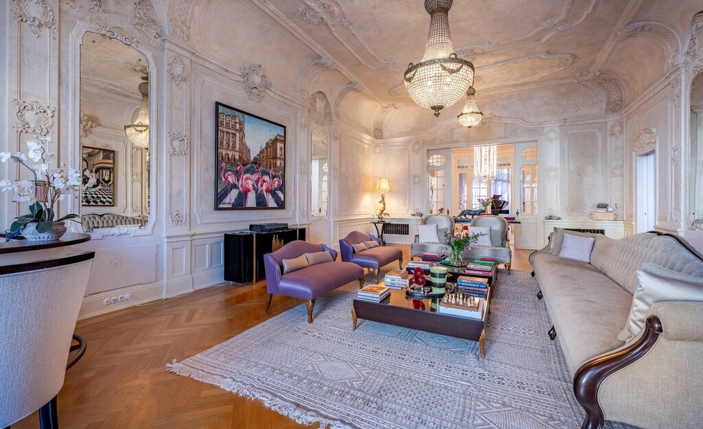 Die größte Wohneinheit mit einer Gesamtfläche von ca. 658 m² erstreckt sich über die Beletage und über das erste Obergeschoss. Der Zugang erfolgt über einen repräsentativen Eingang auf der Ostseite und führt durch einen Windfang in das Entrée mit einer Garderobe und drei separaten WCs. Die sich anschließende majestätische Eingangshalle bildet den zentralen Ausgangspunkt der Beletage und ermöglicht den Zugang zu allen Räumen dieser Ebene. Der ca. 77 m² große Wohnbereich mit der eleganten Bar ist von außergewöhnlichen Stuckornamenten gesäumt. Zudem befinden sich auf dieser Ebene nach Süden ausgerichtet das großzügige Esszimmer und drei weitere Zimmer. Von hier aus ist der Vordergarten des Hauses über eine Terrasse mit neobarocken Säulen und Fassadenelementen zu begehen. Die Küche mit angrenzendem Hauswirtschaftsraum ermöglicht den Zugang sowohl in den Wohnbereich als auch über eine großzügige Terrasse in den rückwärtigen Garten der Villa. Die gesamte Ebene ist mit original Eichenparkett in Fischgrätmuster belegt, welches aufwendig aufgearbeitet worden ist.