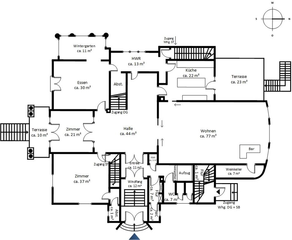 Die Villa ist in drei großzügige Wohnungen und in eine Gewerbeeinheit unterteilt, eine Abgeschlossenheitsbescheinigung liegt vor. Im Souterrain befindet sich die Gewerbeeinheit mit einer Gesamtfläche von ca. 304 m². Der Zugang erfolgt über einen eigenen Eingang auf der Westseite der Villa. Die Wohnungen im zweiten Obergeschoss mit einer Gesamtfläche von ca. 296 m² und im Dachgeschoss mit einer Gesamtfläche von ca. 175 m² wurden bisher nicht ausgebaut und ermöglichen damit viele neue Optionen. Eine Genehmigung für den Ausbau einer Dachterrasse liegt vor.