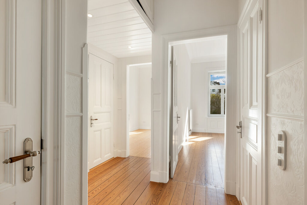 Auf Sie warten: ca. 90 m² Außenbereich, großzügige Wohnflächen, fünf Zimmer, beeindruckende Deckenhöhen von ca. 3,50 Metern und ein Balkon schaffen ein Wohngefühl, das Raum, Licht und Eleganz vereint. Originale Dielenböden, maßgefertigte und teils erhaltene Türen aus dem Baujahr sowie fein abgestimmte Details wie Türgriffe, Lichtschalter und Fenster verbinden den Charakter eines klassischen Patrizierhauses mit modernster Technik - authentisch im Stil, kompromisslos im Anspruch. Abgerundet wird dieses besondere Zuhause durch 5-Jahre-Bauträgergewährleistung. Ein Ort mit Seele, Qualität und zeitloser Eleganz - geschaffen für Menschen, die den karierten Maikäfer suchen.