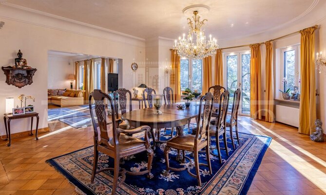 Im Inneren begeistert die Villa mit großzügigen Wohnbereichen, in denen historische Details auf modernen Komfort treffen. Das einladende Entrée auf der Rückseite des Hauses führt über einen weitläufigen Flur in das Wohn - und Esszimmer, die nicht nur einen herrlichen Blick ins Grüne sondern auch einen direkten Zugang auf die ausladende Terrasse bietet. Die Wände sind mit aufwendiger venezianischer Spachteltechnik verziert, welche an flüssigen Marmor erinnern und zu den hochwertigsten Malerarbeiten zählen. Ein imposanter Kamin im Wohnbereich sorgt für eine warme, behagliche Atmosphäre und lädt zu gemütlichen Stunden mit Familie und Freunden ein. Zwei zusätzliche Zimmer sowie ein Gäste-WC und ein Bad ergänzen das Erdgeschoss.