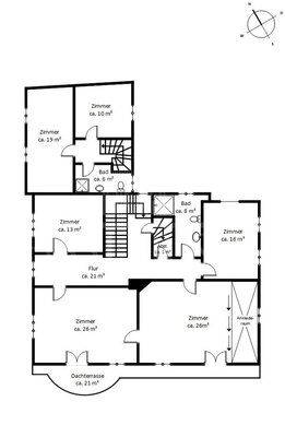 Im Obergeschoss bieten vier Schlafzimmer und ein großes Bad ausreichend Platz für die ganze Familie. Mit einem separaten Eingang bietet eine Einliegerwohnung zusätzlichen Komfort und rundet das Raumangebot ideal ab. Die Einliegerwohnung befindet sich derzeit noch in einem unsanierten Zustand und bedarf einer liebevollen Zuwendung. Insgesamt bietet das Haus eine Wohnfläche von ca. 365 m², welche durch einen zusätzlichen großen Spitzboden mit einer Nutzfläche von ca. 98 m² weiteren Stauraum ermöglicht.