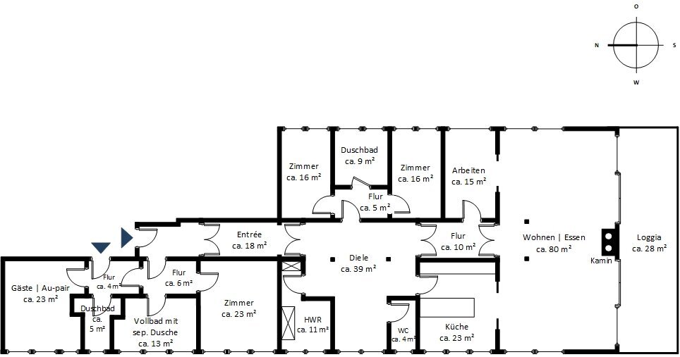 Die exklusive Wohnung liegt im 2. Obergeschoss (Endetage) des Hauses „Elsässer“ und bietet eine der schönsten Blickbeziehungen auf die Reemtsma Villa sowie in den westlichen Teil des Reemtsma Park. Die Wohnung ist bequem per Aufzug erreichbar und verfügt über einen Gäste- bzw. Einliegerbereich. Die hochwertige Poggenpohl-Küche mit Miele-Geräten, Steinarbeitsplatte und Tresen erfüllt auch hohe Ansprüche. Der großzügige Wohn- und Essbereich mit Kamin öffnet sich zur überdachten Süd-Loggia über die gesamte Gebäudebreite und bietet einen einzigartigen Blick auf den Park und die historische Reemtsma Villa. Die Wohnung verfügt neben einem Arbeitszimmer über insgesamt drei gut geschnittene Schlafzimmer mit großen Fensterflächen sowie einen separaten Gästebereich mit eigenem Zugang und Bad. Ein Hauswirtschaftsraum, ein Keller und zahlreiche Ausstattungsdetails wie bodentiefe Fenster, individuelle Licht- und Temperatursteuerung runden das Angebot ab.