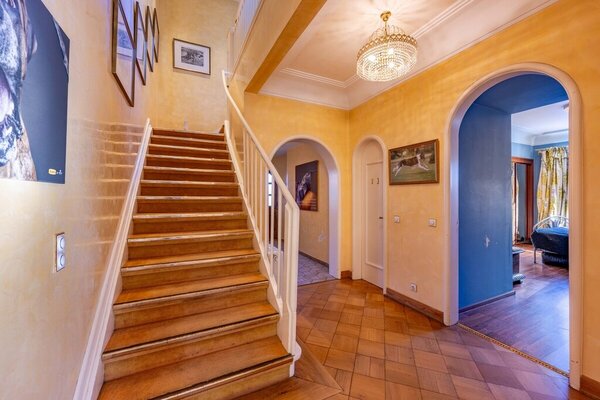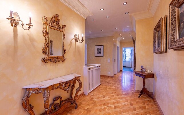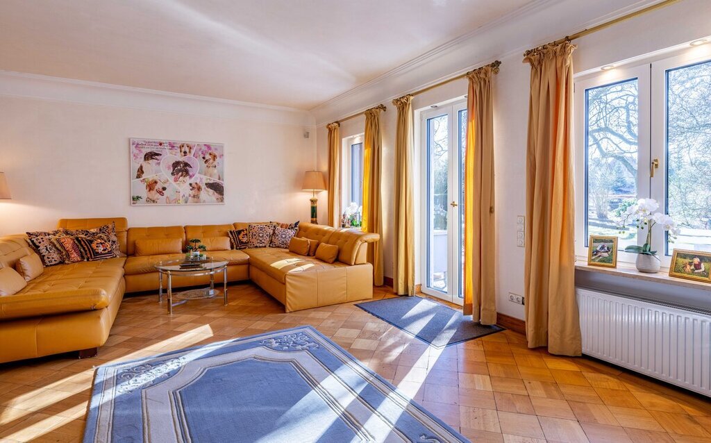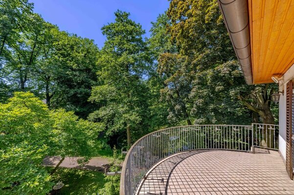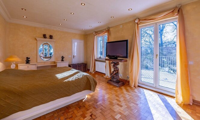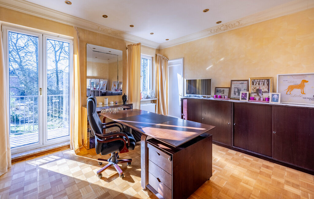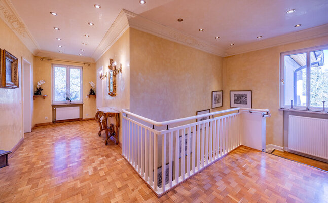 Im Obergeschoss stehen vier Schlafzimmer und ein großes Bad zur Verfügung. Eine Einliegerwohnung mit separatem Eingang erweitert das Raumangebot, ist jedoch sanierungsbedürftig. Insgesamt bietet die Villa ca. 365 m² Wohnfläche; ein großer Spitzboden (ca. 98 m² Nutzfläche) bietet weiteren Stauraum.