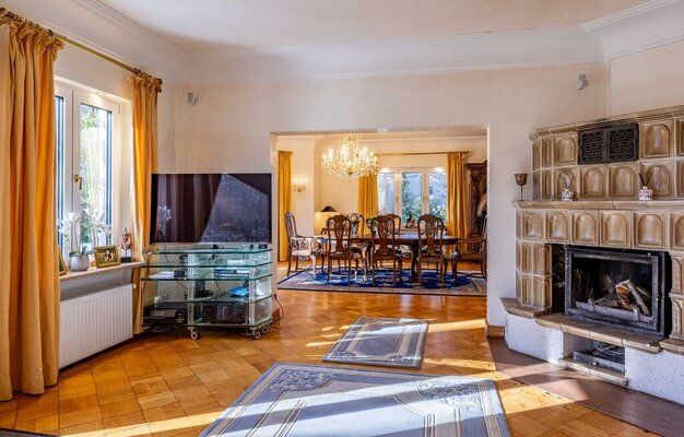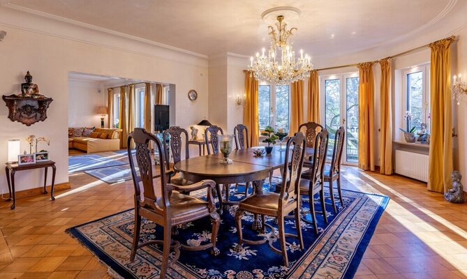 Im Inneren verbindet die Villa großzügige Räume mit historischem Charme und modernen Akzenten. Das Entrée führt in den Wohn- und Essbereich mit Blick ins Grüne und Zugang zur großen Terrasse. Hochwertige venezianische Spachteltechnik verleiht den Wänden eine edle Anmutung, ein Kamin sorgt für wohltuende Atmosphäre. Zwei weitere Zimmer, ein Bad und ein Gäste-WC vervollständigen das Erdgeschoss.