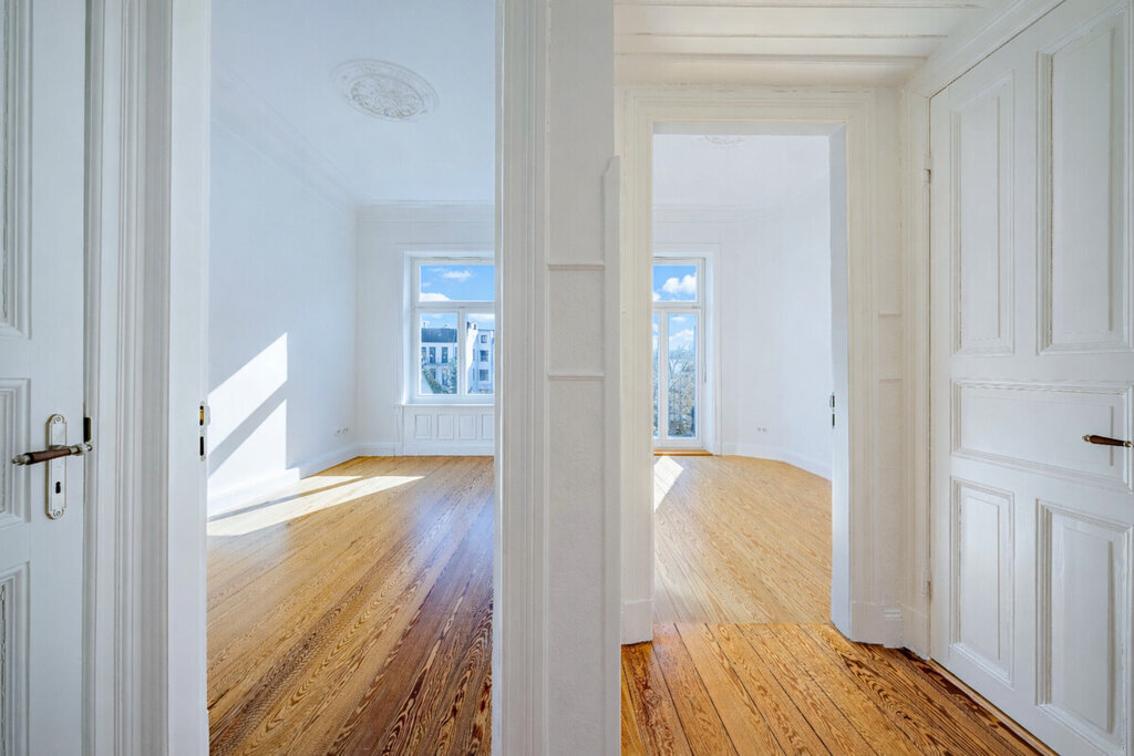 Großzügige Wohnflächen, fünf Zimmer, beeindruckende Deckenhöhen von ca. 3,50 Metern und gleich zwei Balkone schaffen ein Wohngefühl, das Raum, Licht und Eleganz vereint. Originale Dielenböden, maßgefertigte und teils erhaltene Türen aus dem Baujahr sowie fein abgestimmte Details wie Türgriffe, Lichtschalter und Fenster verbinden den Charakter eines klassischen Patrizierhauses mit modernster Technik - authentisch im Stil, kompromisslos im Anspruch.