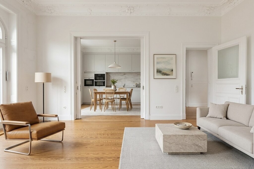 Ein 2024 mit großer Sorgfalt revitalisiertes und komplett modernisiertes Patrizierhaus in begehrter Lage von Harvestehude - für Menschen, die urbanes Leben mit Stil, Komfort und Substanz verbinden möchten. Aufzug und barrierearmer Zugang machen das Ankommen hier ebenso selbstverständlich wie angenehm.