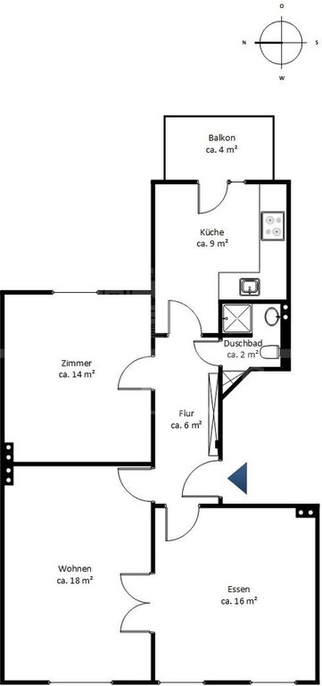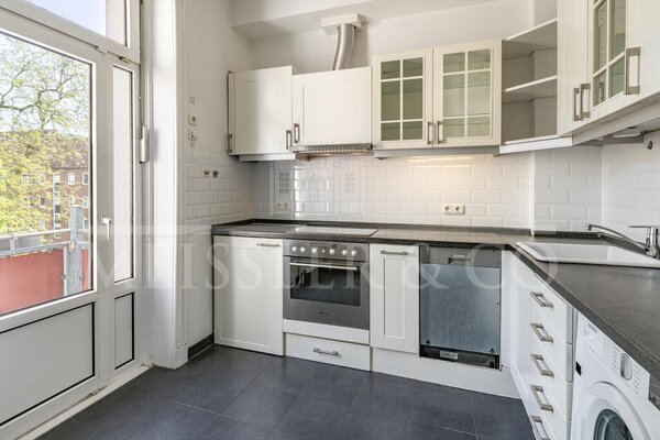 Die helle Küche mit schlichter, weißer Einbauküche ist ein echtes Highlight: Von hier aus gelangt man direkt auf den Balkon, der sich perfekt für das Frühstück in der Morgensonne eignet. Im Wohnbereich taucht die Nachmittagssonne die Räume in warmes Licht und unterstreicht die freundliche Atmosphäre dieser besonderen Wohnung.