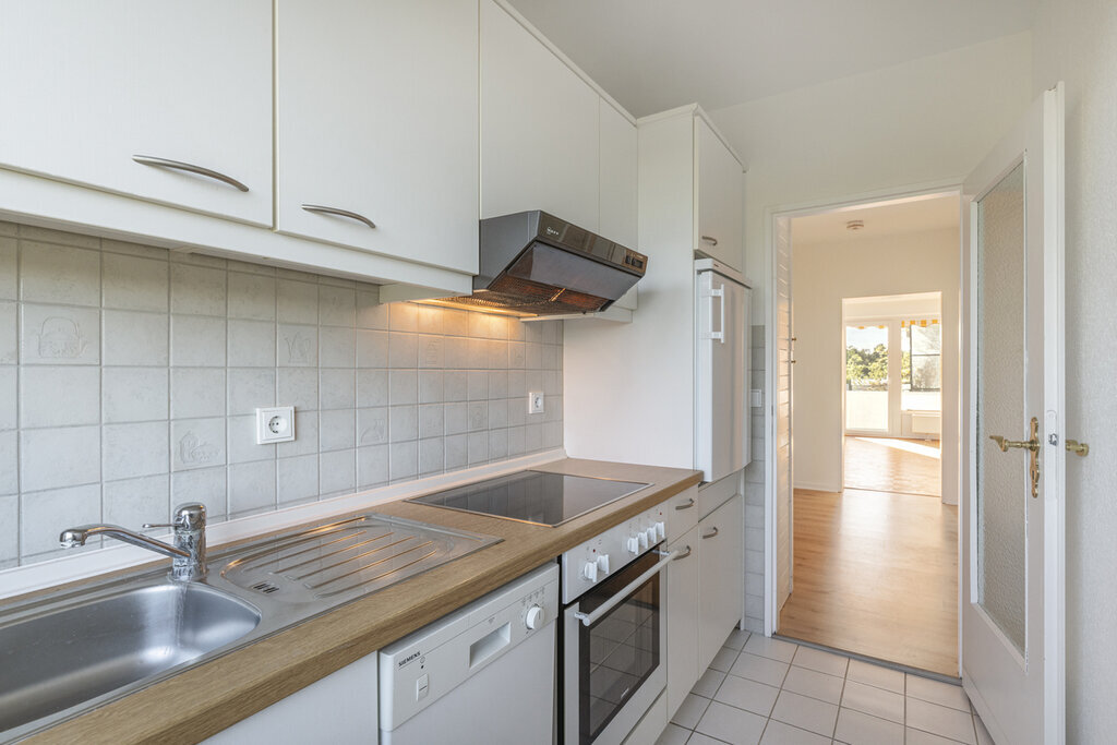 Die separate Küche ist mit weißen Einbauten und Geräten ausgestattet und bietet ausreichend Platz zum Kochen und Genießen - auch hier beeindruckt der herrliche Weitblick. Das Duschbad mit Fenster präsentiert sich hell und gepflegt. Im Keller befindet sich ein geräumiger Abstellraum der zur Wohnung gehört und besonders komfortabel ist der Stellplatz in der Tiefgarage.
