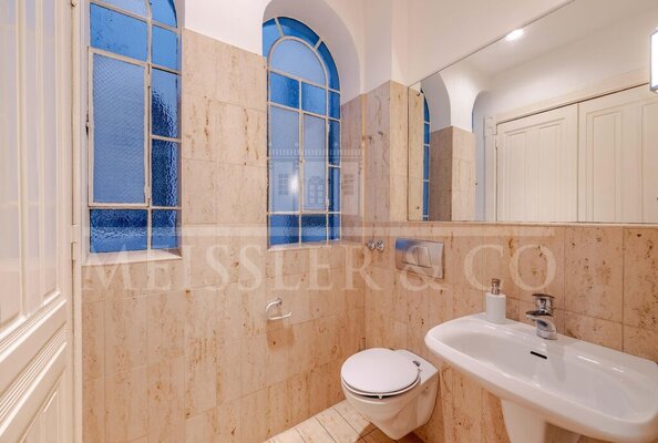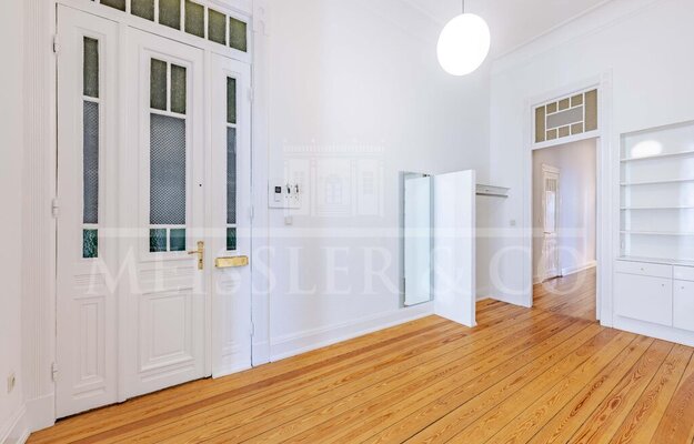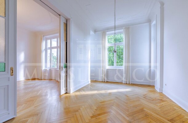 Auf ca. 221 m² Wohnfläche, verteilt sich diese Wohnung im zweiten Obergeschoss auf 7,5 Zimmer und eröffnet ein Ambiente, das seinesgleichen sucht: hohe Decken von beeindruckenden 3,80 Metern Höhe, edles Fischgrätparkett, originale Pitchpinedielen und prachtvolle Stuckverzierungen schaffen eine Atmosphäre, die sowohl repräsentativ als auch wohnlich-elegant ist.