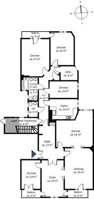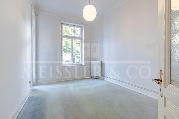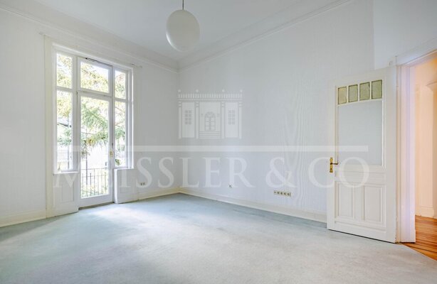 Besonders hervorzuheben ist das klassische Berliner Zimmer, das durch seine Großzügigkeit und Lichtfülle zum Herzstück der Wohnung avanciert. Von hier aus gelangt man durch eine originale Flügeltür in das Esszimmer mit seinen prachtvollen Stuckelementen und dem Austritt auf einen der beiden Südbalkone. Angrenzen und ebenfalls durch ein originales Schiebeelement zu betreten liegt der Wohnbereich der einen Austritt auf einen der beiden Balkone bietet. Den Abschluss der nach Süden gerichteten Zimmer bildet das Arbeitszimmer mit dem angrenzenden Balkon. Der gesamte Wohnbereich lebt von den großen Fenstern und dem Blick in die Grüne Umgebung.