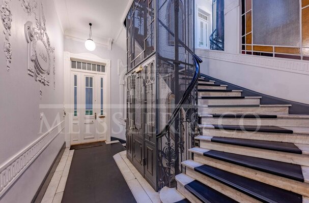 In einem der prächtigsten, denkmalgeschützten Jugendstilgebäude dieser renommierten Straße, errichtet im Jahre 1905 nach dem Entwurf von Edgar Foßhag, öffnet sich eine Wohnwelt, die hanseatische Eleganz und historischen Glanz in seltener Vollkommenheit vereint. Schon das Entrée beeindruckt: Über einen historischen Fahrstuhl oder das opulente Treppenhaus mit weitläufigem Aufgang und großen stuckverzierten Spiegeln entfaltet sich der unvergleichliche Charme des Jugendstils.