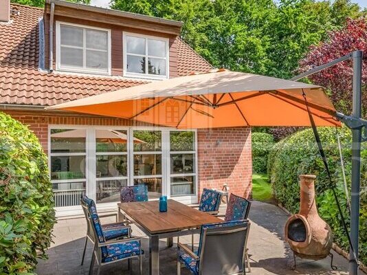 Im Inneren überzeugt ein durchdachtes Raumkonzept mit lichtdurchfluteten Bereichen, stilvollen Details und wertiger Substanz. Highlight ist der nach Westen ausgerichtete Wintergarten mit komplett verschiebbaren Glaswänden, Unterglasmarkise und direktem Zugang zur Sonnenterrasse – ein fließender Übergang zwischen Innen- und Außenbereich. Die Küche im gepflegten Landhausstil bietet eine optimale Aufteilung, erhöhte Arbeitsflächen sowie Miele- und Liebherr-Geräte. Die Bäder sind funktional und bieten Modernisierungspotenzial. Das Obergeschoss umfasst drei gut geschnittene Zimmer.