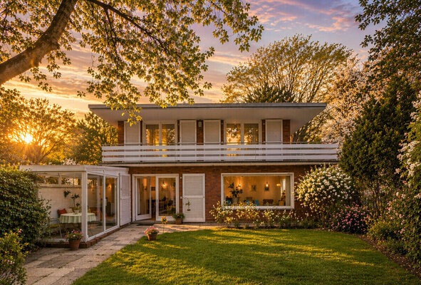 Dieses architektonisch herausragende Einfamilienhaus aus dem Jahr 1961, entworfen vom renommierten Architekten Röpcke, verkörpert in authentischer Weise die Eleganz und Klarheit der Mid-Century-Moderne. Willkommen in einem Refugium, das den Geist des Aufbruchs und die Ästhetik der 1960er Jahre in ihrer reinsten Form bewahrt hat und durch eine seiner Zeit vorausgewesene architektonische Handschrift besticht. Auf ca. 176 m² Wohnfläche entfaltet sich ein durchdachtes Raumkonzept mit fünfeinhalb Zimmern, darunter vier Schlafzimmer, zwei Bäder sowie ein großzügiger Wohn- und Essbereich mit Kamin. Großflächige, teils bodentiefe Fenster schaffen fließende Übergänge zwischen Innen- und Außenraum und durchfluten das Haus mit Licht, während Naturstein in der Diele und edler Holzboden den stilprägenden Charakter unterstreichen. Klare Linien, harmonische Proportionen und dekorative Außenklappläden verleihen der Architektur ihre zeitlose Leichtigkeit. Der breite Balkon sowie der sonnige, uneinsehbare Garten mit ca. 890 m² bieten Rückzugsorte im Grünen. Das vollunterkellerte Haus verfügt über vielseitige Nutzflächen sowie einen separat zugänglichen Wintergarten, ideal als Atelier oder Lounge. Eine Garage ist vorhanden, beheizt wird über eine moderne Gasheizung. Diese Immobilie verbindet architektonische Substanz mit großem Potenzial zur behutsamen Modernisierung und ist ein seltenes Angebot für für Liebhaber ikonischer 60er-Jahre-Architektur.