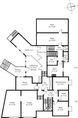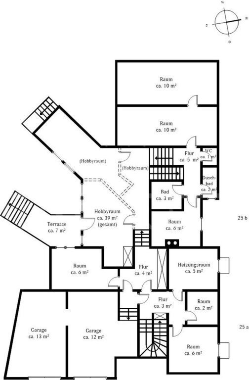 Das vordere Haus (Nr. 25 a) begeht man über einen Gehweg oder über die Stellplätze, die vor der Doppelgarage angelegt sind. Von dort aus gelangt man zu dem größeren und von der Straße abgewandten Einfamilienhaus (Nr. 25 b). Im Souterrain dieses Hauses befinden sich neben den Wohnräumen im Erd-und Obergeschoss noch drei weitere Räume, die durch große Fenster eine sehr gute Belichtung haben und daher in der Vergangenheit auch zu Wohnzwecken genutzt wurden. Die Garagen können ebenfalls direkt vom Souterrain aus begangen werden, sodass man immer trockenen Fußes die Wohnbereiche erreichen kann.