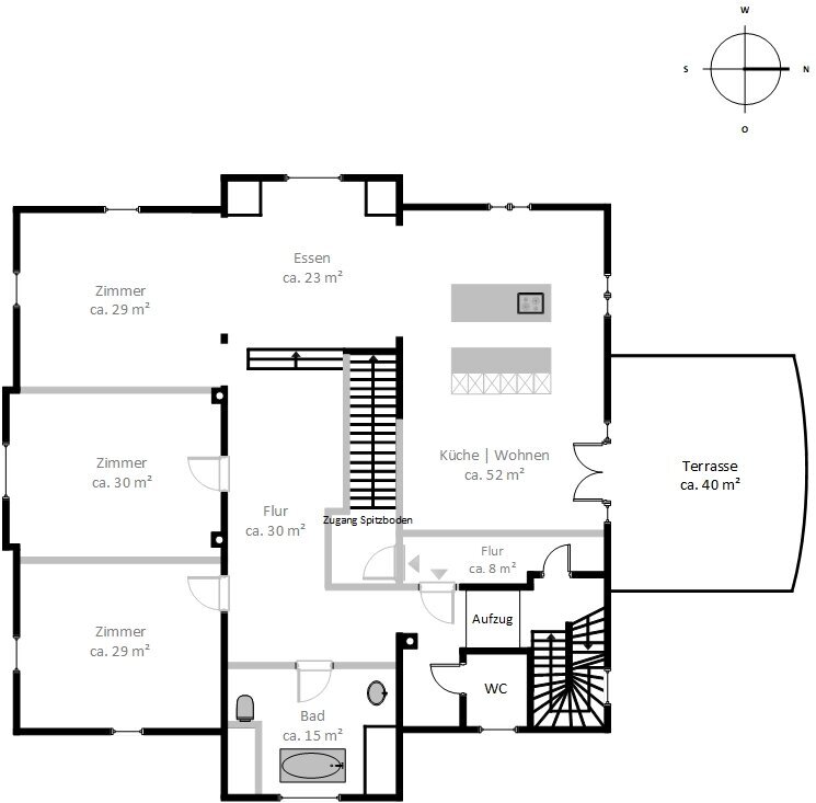 Der interne Fahrstuhl und ein separates Treppenhaus führen bis in das zweite Obergeschoss der Villa.