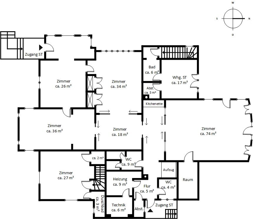Die Villa ist in drei großzügige Wohnungen und in eine Gewerbeeinheit unterteilt, eine Abgeschlossenheitsbescheinigung liegt vor. Im Souterrain befindet sich die Gewerbeeinheit mit einer Gesamtfläche von ca. 304 m². Der Zugang erfolgt über einen eigenen Eingang auf der Westseite der Villa. Die Wohnungen im zweiten Obergeschoss mit einer Gesamtfläche von ca. 296 m² und im Dachgeschoss mit einer Gesamtfläche von ca. 175 m² wurden bisher nicht ausgebaut und ermöglichen damit viele neue Optionen. Eine Genehmigung für den Ausbau einer Dachterrasse liegt vor.