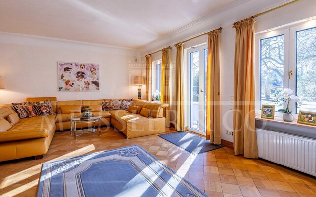 Im Inneren begeistert die Villa mit großzügigen Wohnbereichen, in denen historische Details auf modernen Komfort treffen. Das einladende Entrée auf der Rückseite des Hauses führt über einen weitläufigen Flur in das Wohn - und Esszimmer, die nicht nur einen herrlichen Blick ins Grüne sondern auch einen direkten Zugang auf die ausladende Terrasse bietet. Die Wände sind mit aufwendiger venezianischer Spachteltechnik verziert, welche an flüssigen Marmor erinnern und zu den hochwertigsten Malerarbeiten zählen. Ein imposanter Kamin im Wohnbereich sorgt für eine warme, behagliche Atmosphäre und lädt zu gemütlichen Stunden mit Familie und Freunden ein. Zwei zusätzliche Zimmer sowie ein Gäste-WC und ein Bad ergänzen das Erdgeschoss.