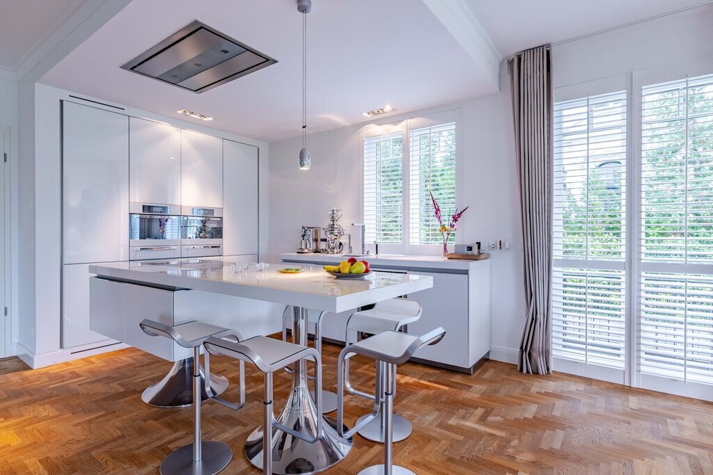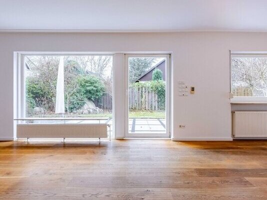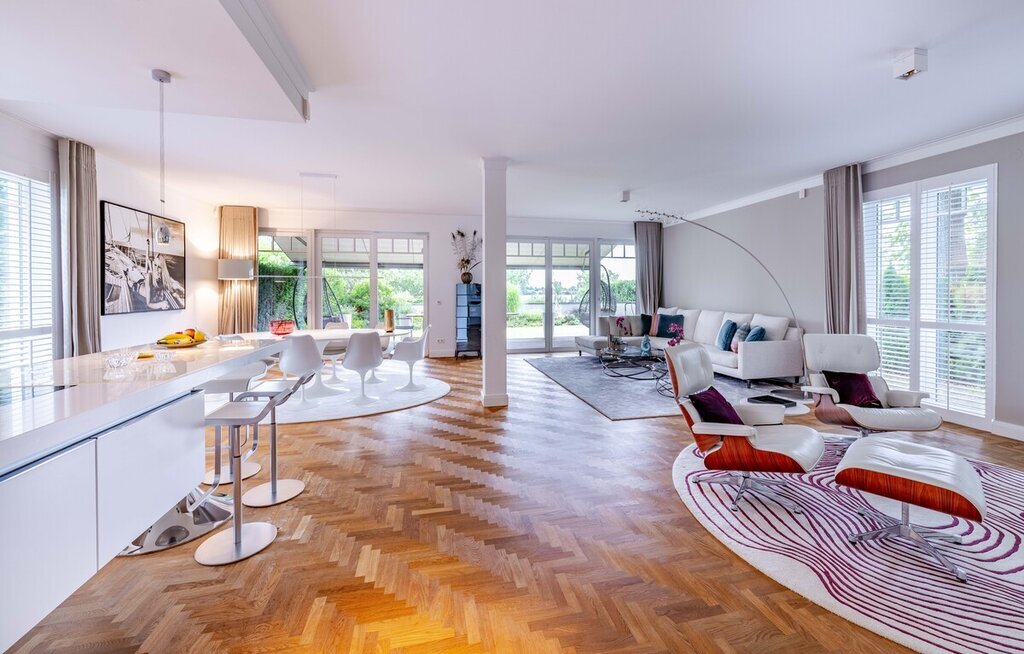 Das Herzstück bildet der großzügige Wohn- und Essbereich mit offener, hochwertig ausgestatteter Miele-Küche samt eleganter Kochinsel. Große Fensterflächen verbinden innen und außen und führen auf die weitläufige Terrasse mit Elbblick. Zudem gehört ein Sondernutzungsrecht am Garten zur Wohnung.