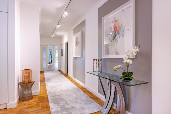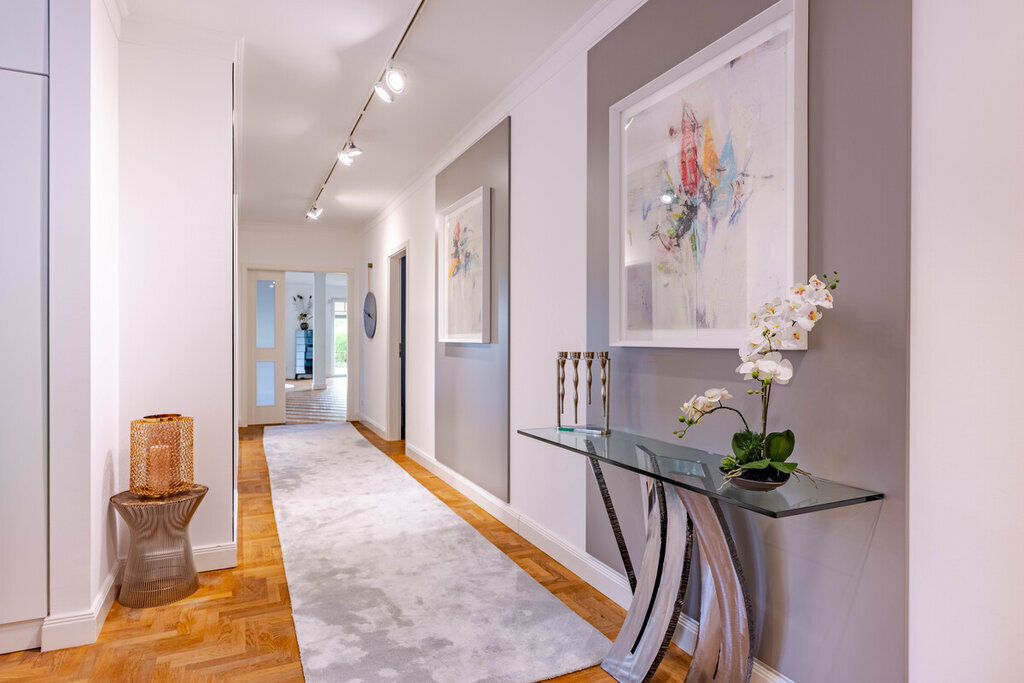 Die ca. 192 m² große Erdgeschosswohnung erstreckt sich über das gesamte Geschoss und verfügt über einen direkten, privaten Zugang vom Fahrstuhl. Bereits beim Betreten eröffnet sich eine durchgehende Blickachse bis zur Elbe. Hohe Decken, ausgesuchte Materialien wie Fischgrätparkett und ein durchdachter Grundriss sorgen für ein exklusives Wohngefühl.