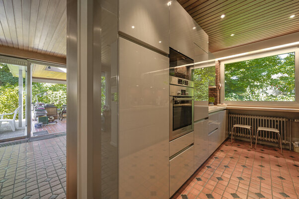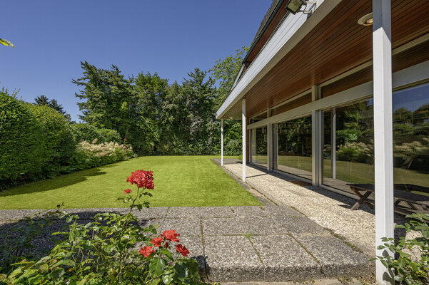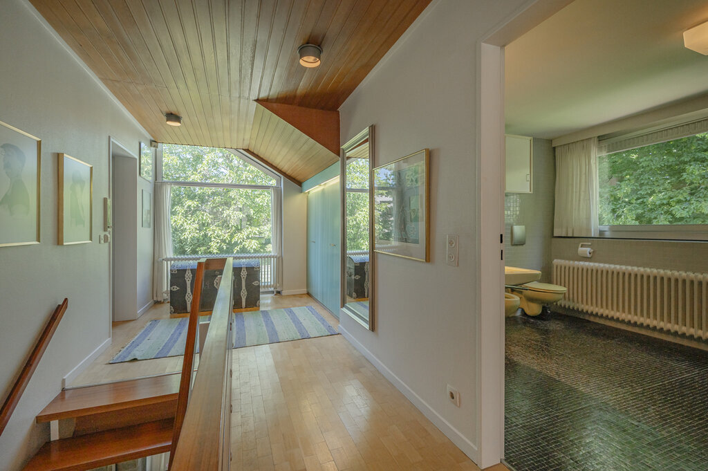 Dieses freistehende Architektenhaus aus den Jahren 1965/66 liegt auf einem ca. 890 m² großen, sonnigen Südgrundstück und überzeugt durch gepflegten Zustand und zeitlose Architektur. Mit rund 222 m² Wohnfläche und ca. 126 m² Nutzfläche im teilausgebauten Souterrain bietet es großzügigen Raum für Familie, Arbeiten und individuelle Entfaltung. Zwei harmonische Erweiterungen (1983/84 und 1993) fügen sich nahtlos in das klare, lichtdurchflutete Konzept ein. Große Fenster, Parkettböden und italienische Fliesen schaffen ein stilvolles Ambiente, während geschickt platzierte Deckenfenster und ein Kamin im Wohnzimmer für Helligkeit und Behaglichkeit sorgen. Vier der sieben Zimmer eignen sich ideal als Schlafzimmer, teils mit Balkon oder Loggia. Die moderne Schüller-Küche (2015), drei Bäder und eine Alarmanlage bieten hohen Komfort. Technisch ist das Haus gepflegt: Ölheizung von 2003, regelmäßig gewartet; das Schieferdach betont den hochwertigen Charakter. Weitläufige, teils überdachte Terrassen und eine Doppelgarage runden das Angebot ab. Ein Haus mit Charakter, Qualität und besonderer Atmosphäre – ideal für Familien, die Großzügigkeit und Lage schätzen.