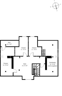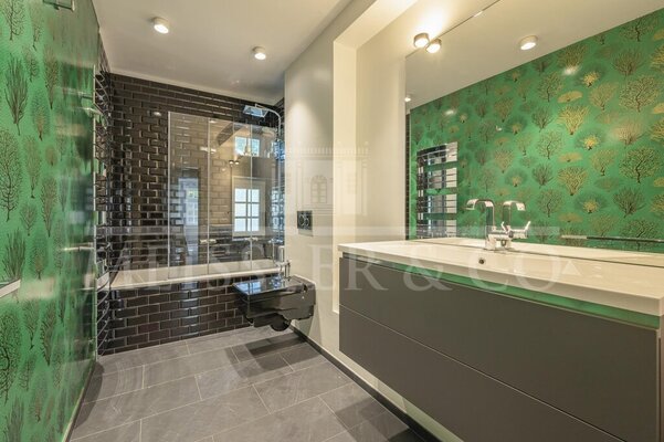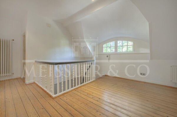 Im Obergeschoss befinden sich ein Hauptschlafzimmer mit angrenzendem Ankleidezimmer und weitere 4 Zimmer. Aktuell ist dort in allen Zimmern und dem Flur ein heller, sehr hochwertiger Velours- Teppichboden auf dem Dielenboden verlegt. Ein Duschbad und ein Vollbad sind mit hochwertigen Sanitärobjekten und Armaturen ausgestattet. Auch auf dieser Ebene ermöglichen viele Fensterflächen eine gute Belichtung. Im Dachgeschoss befinden sich weitere 3 Zimmer und der Zugang zum Spitzboden.