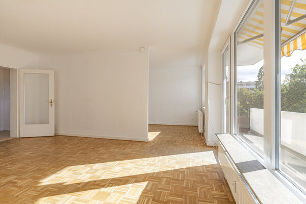 Der große Wohnbereich ist lichtdurchflutet und öffnet sich zu einem geräumigen Balkon, der zum Entspannen und Genießen des Ausblicks einlädt. Aufgrund der Höhe genießt man hier eine außergewöhnlich ruhige und private Wohnsituation mit viel Tageslicht.