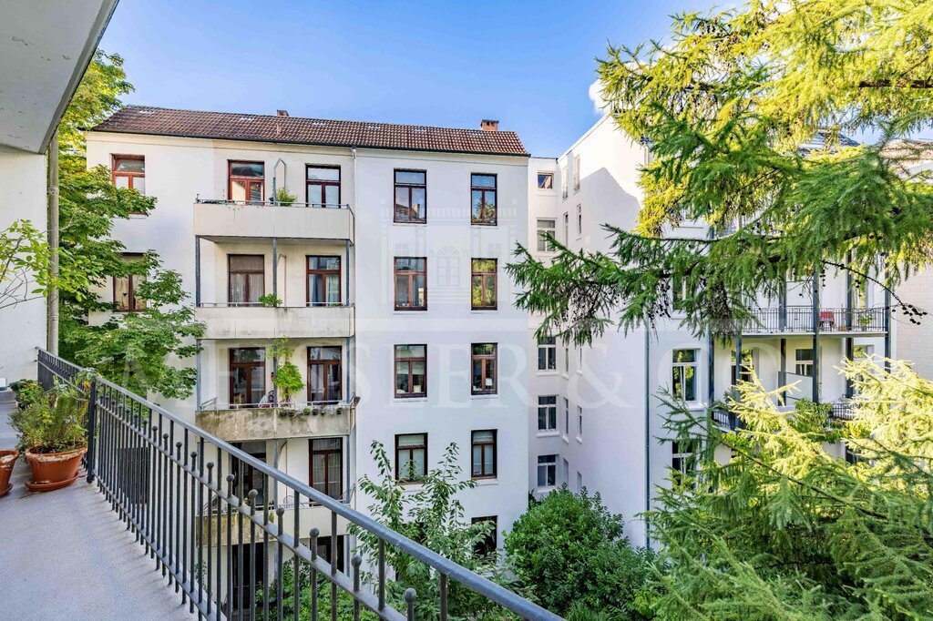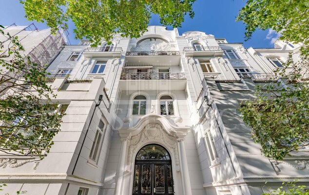 In einem der prächtigsten, denkmalgeschützten Jugendstilgebäude dieser renommierten Straße, errichtet im Jahre 1905 nach dem Entwurf von Edgar Foßhag, öffnet sich eine Wohnwelt, die hanseatische Eleganz und historischen Glanz in seltener Vollkommenheit vereint. Schon das Entrée beeindruckt: Über einen historischen Fahrstuhl oder das opulente Treppenhaus mit weitläufigem Aufgang und großen stuckverzierten Spiegeln entfaltet sich der unvergleichliche Charme des Jugendstils.