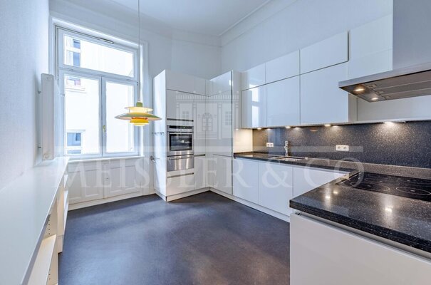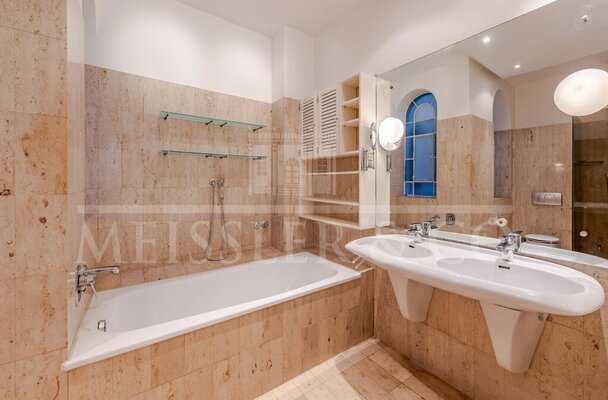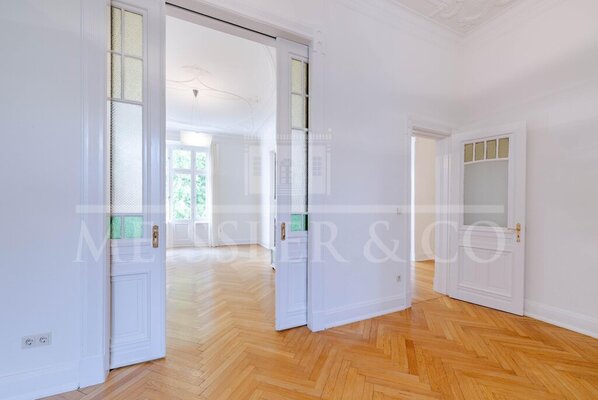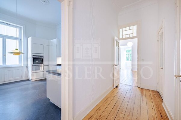 Auf ca. 221 m² Wohnfläche, verteilt sich diese Wohnung im zweiten Obergeschoss auf 7,5 Zimmer und eröffnet ein Ambiente, das seinesgleichen sucht: hohe Decken von beeindruckenden 3,80 Metern Höhe, edles Fischgrätparkett, originale Pitchpinedielen und prachtvolle Stuckverzierungen schaffen eine Atmosphäre, die sowohl repräsentativ als auch wohnlich-elegant ist.