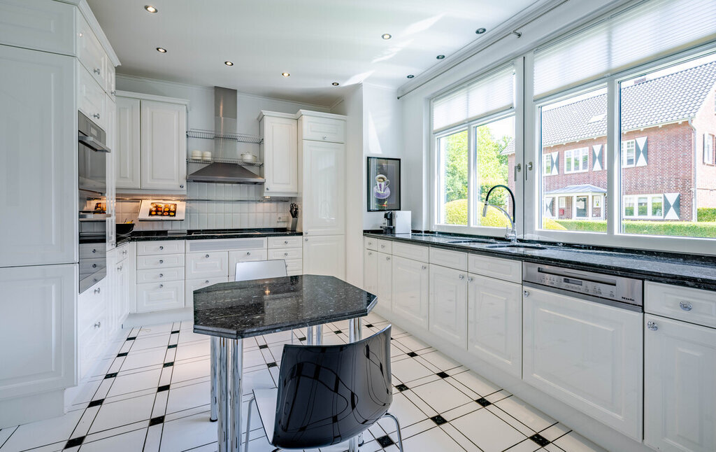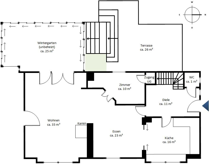 Im Inneren überzeugt ein durchdachtes Raumkonzept mit lichtdurchfluteten Bereichen, stilvollen Details und wertiger Substanz. Highlight ist der nach Westen ausgerichtete Wintergarten mit komplett verschiebbaren Glaswänden, Unterglasmarkise und direktem Zugang zur Sonnenterrasse – ein fließender Übergang zwischen Innen- und Außenbereich. Die Küche im gepflegten Landhausstil bietet eine optimale Aufteilung, erhöhte Arbeitsflächen sowie Miele- und Liebherr-Geräte. Die Bäder sind funktional und bieten Modernisierungspotenzial. Das Obergeschoss umfasst drei gut geschnittene Zimmer.