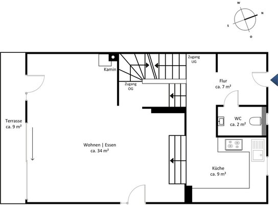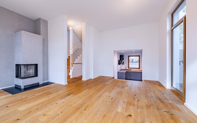 Der familienfreundliche Grundriss im Split-Level-Stil erstreckt sich über insgesamt sieben Ebenen und eröffnet vielseitige Nutzungsmöglichkeiten für unterschiedlichste Lebenskonzepte. Bereits beim Betreten des Hauses empfängt ein großzügiges Entrée mit Garderobenbereich und Gäste-WC. Von hier aus gelangt man in das lichtdurchflutete Wohn- und Esszimmer, das mit einer angenehmen Deckenhöhe ein besonders offenes Raumgefühl schafft und direkten Zugang zur sonnigen Südterrasse sowie zu einer weiteren, kleineren Terrasse in östlicher Ausrichtung bietet. Die angrenzende Küche ist mit einer hochwertigen Einbauküche ausgestattet und fügt sich nahtlos in das durchdachte Raumkonzept ein. Großformatige Fensterflächen, moderne Downlights, ein stilvoller Kamin sowie edle Bodenbeläge unterstreichen den gehobenen Wohnkomfort und schaffen eine wohnliche Atmosphäre.